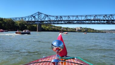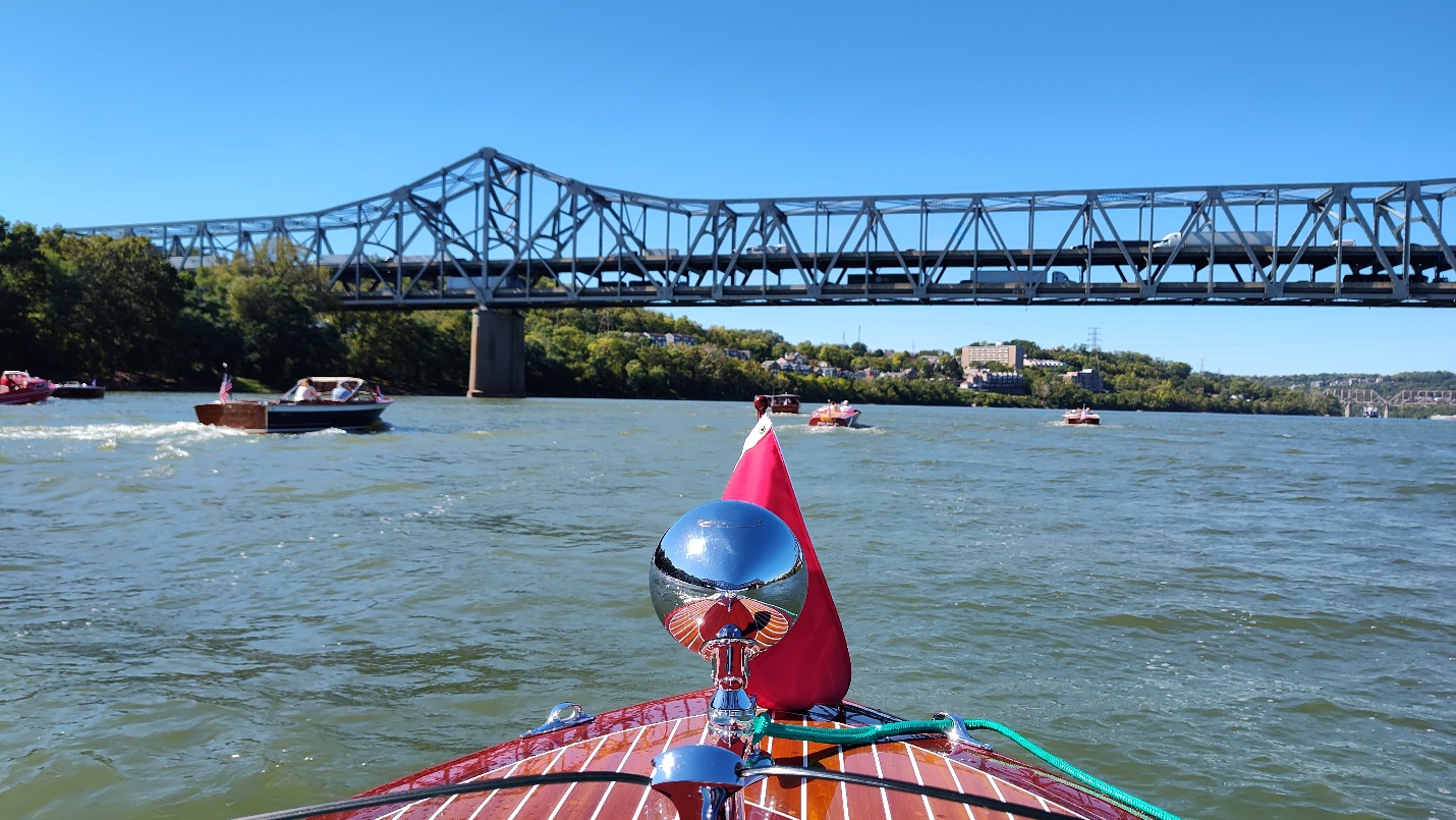 The Ohio Valley chapter of the ACBS was invited to join in the celebration with our antique and classic boats. Roughly 40 wood boats participated in the 5-day event with some traveling from just as far away as the riverboats. Boats arrived on Wednesday and could be spotted cruising on the Ohio river. As a safety precaution, law enforcement closed the river to the public. ACBS participants were issued special River Roots Festival burgees that had to be displayed at all times and gave us unlimited access to the closed river.
